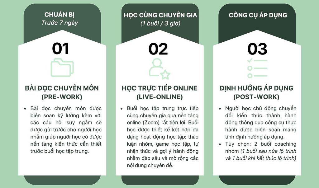 • Cách học mang tính đồng hành, kết hợp phong cách hiện đại và truyền thống, vừa phát huy sự tự chủ của người học qua việc chuẩn bị trước khi đến lớp, đồng thời giữ môi trường học tập trung để người học được củng cố, đào sâu và phát huy tối đa giá trị của tri thức bài bản.